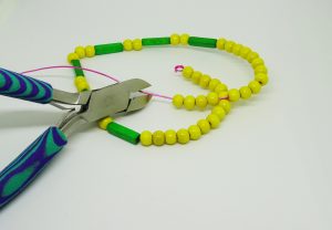 4) Once all the beads are threaded, close one end. Do this by cutting off the excess wire (allowing an extra 15mm approx of wire for the loop), make a loop with your round nosed pliers. Now with one end secured, shape your wire in to a heart. Make a loop on the other end to close (as you did before).