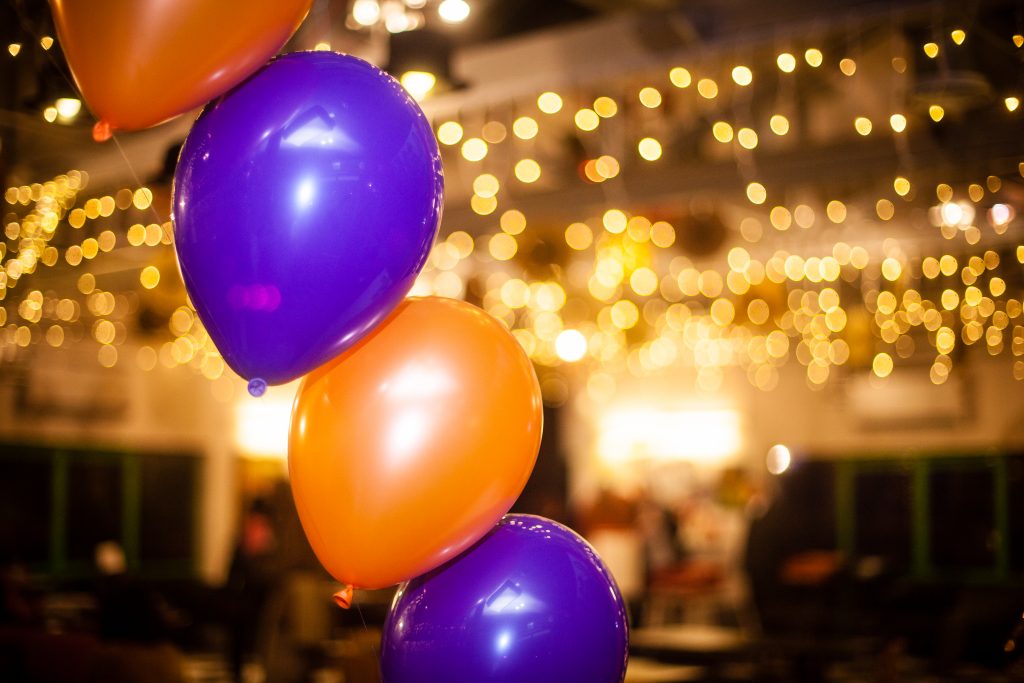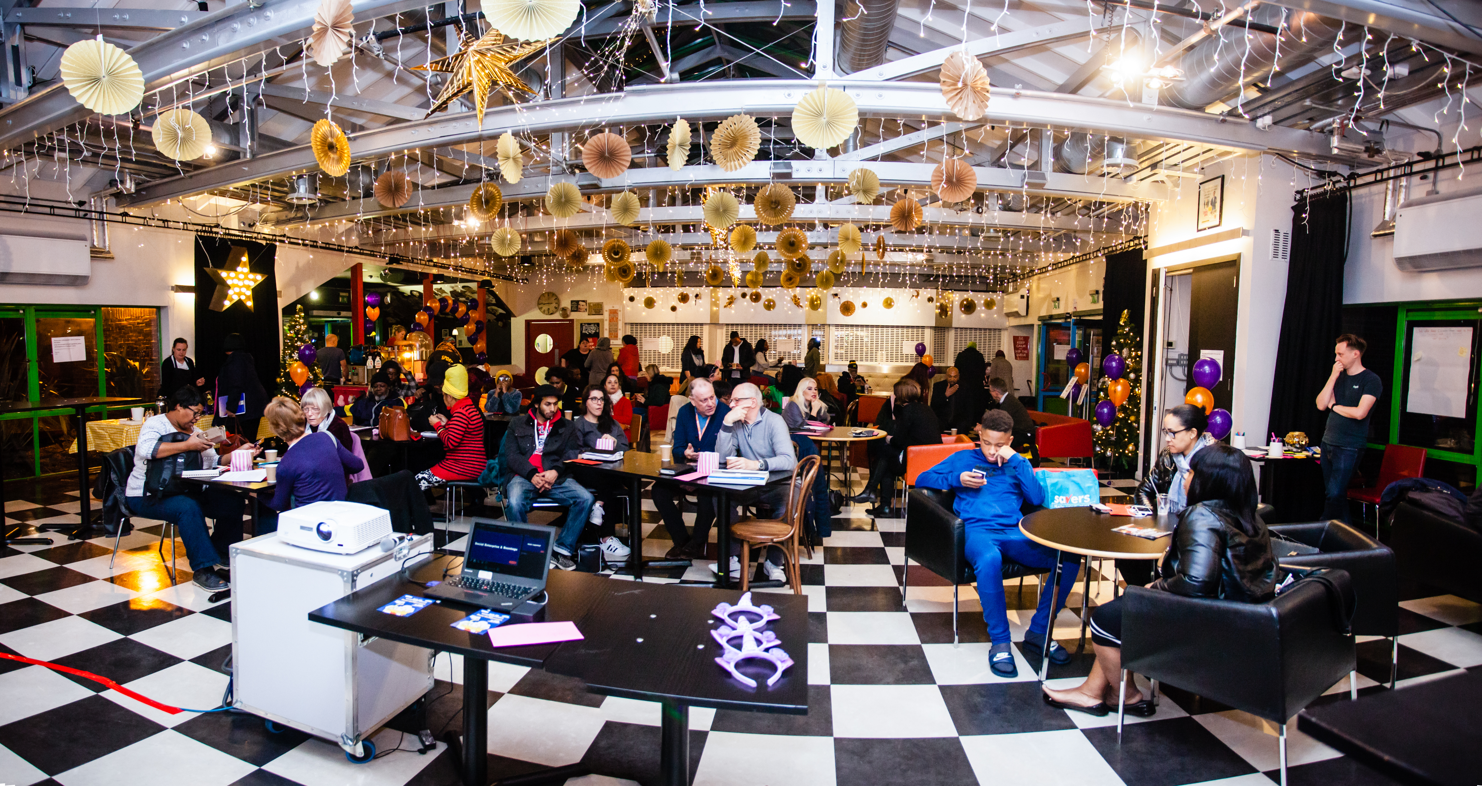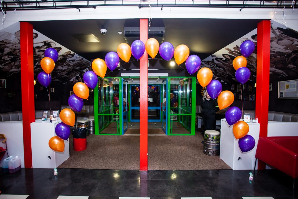 The Millifeld Centre had done a great job with Christmas lights but nothing that represented Unltd. With luck I met the lovely Kim from Kim Saunders Flowers and Balloons. I told here the Unltd colours were Orange and Purple and she created a balloon arch with lots of clusters of balloons dotted around the room in super quick time.