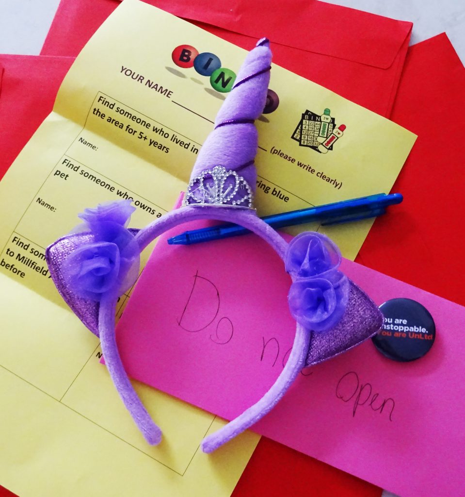 Myself and a helper spent the Saturday prier stuffing envelopes (to match the colours of popcorn bags and candyfloss) with a pen, motivation badge and a bingo sheet. The words DO NOT OPEN were written on the front. I was also in charge of punishment. Anyone who did open the envelopes before they were told to had to wear these Unicorn headbands. Sadly no one broke the rules and the headbands came home with me.